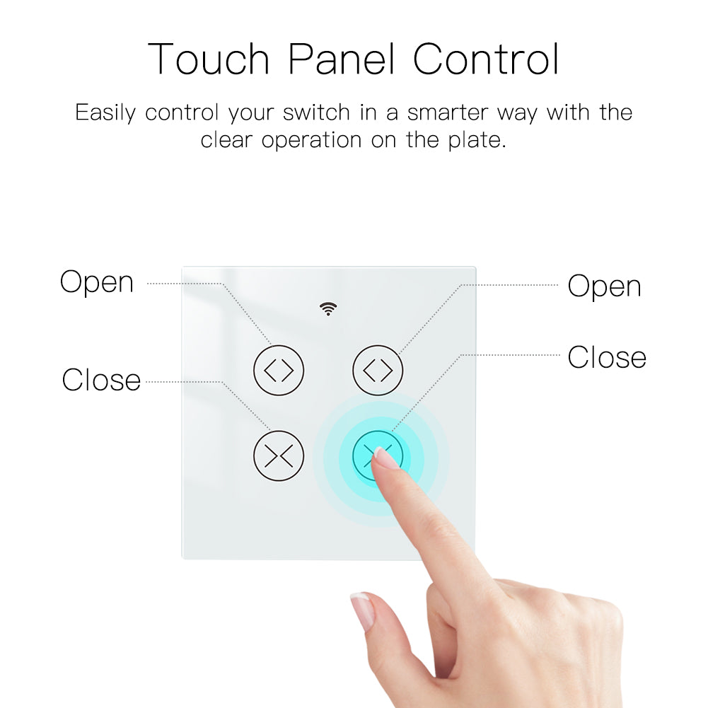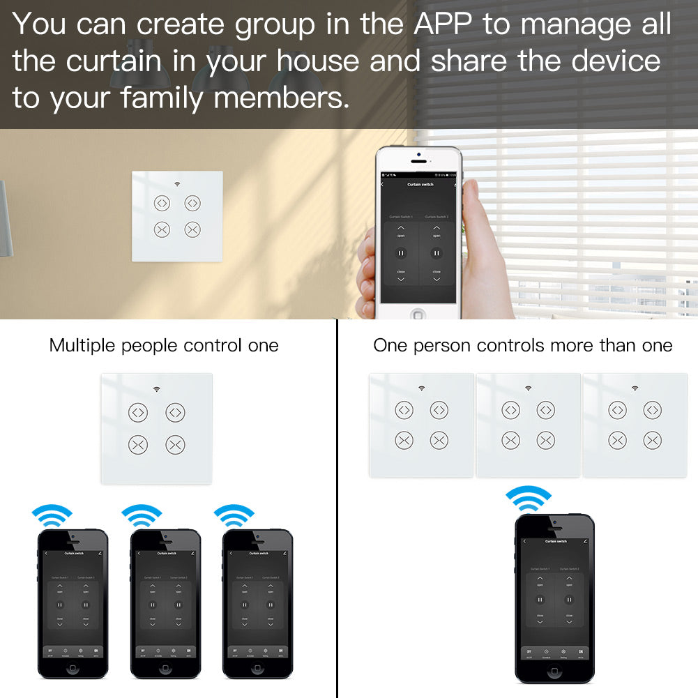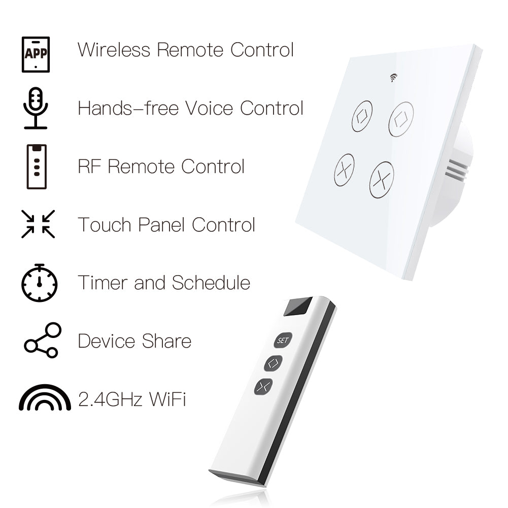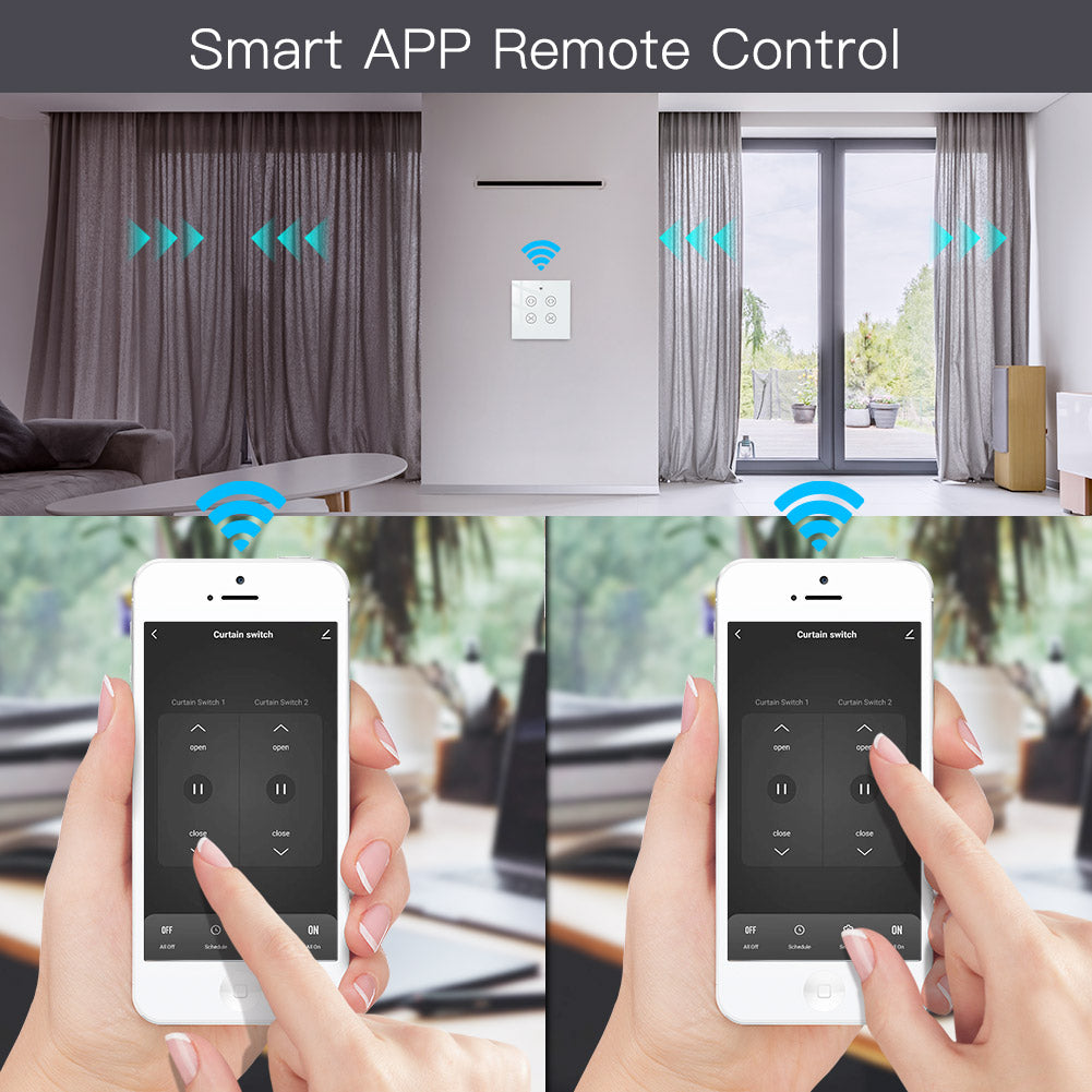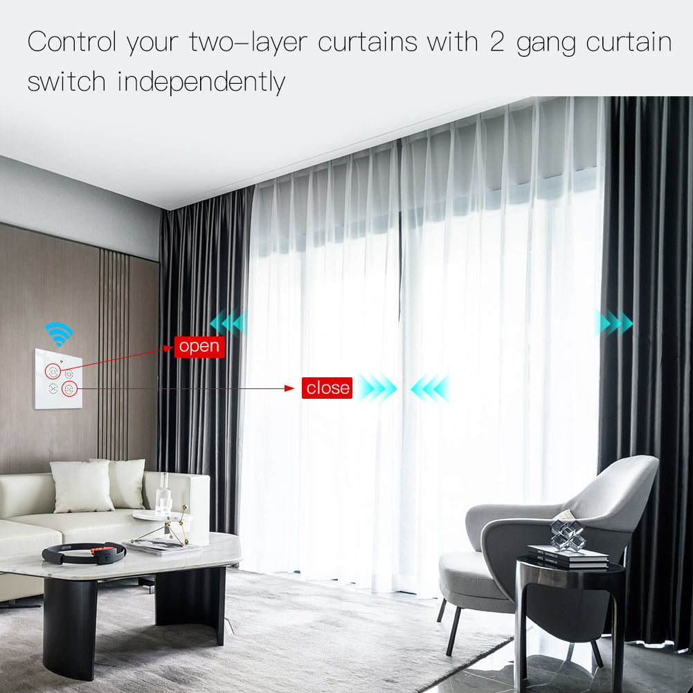 1.Easily transform your house into a smart one with the new powerful functional smart curtain switch;Intelligently control your two roller blinds or shutter curtains in a much easier way with independent controlling modes;or simply press all on/all off button in app for controlling together;RF remote and manual control your curtains optional and available meanwhile with RF frequency built in,so as group control multiple switches with one Remote switch;can work with smart curtain motor for roller shutter/blinds to realize automation for all curtains at home;add motorized shades or other similar devices to your smart home with Smart Curtain Motor!(Note:the curtain motor is not included in the package,you need a self-purchase of it with 4 wires;RF remote control switch is included in the package.)
