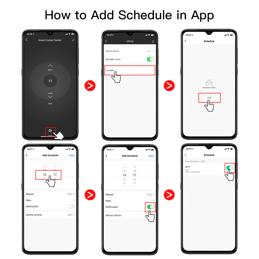 5.Schedules&Countdown:Set schedules to control the curtains on your own timetable. Automatically open your curtain at the time you get up and close the curtain when you go to bed. When you take a nap, set a countdown to open the curtains to wake you up.