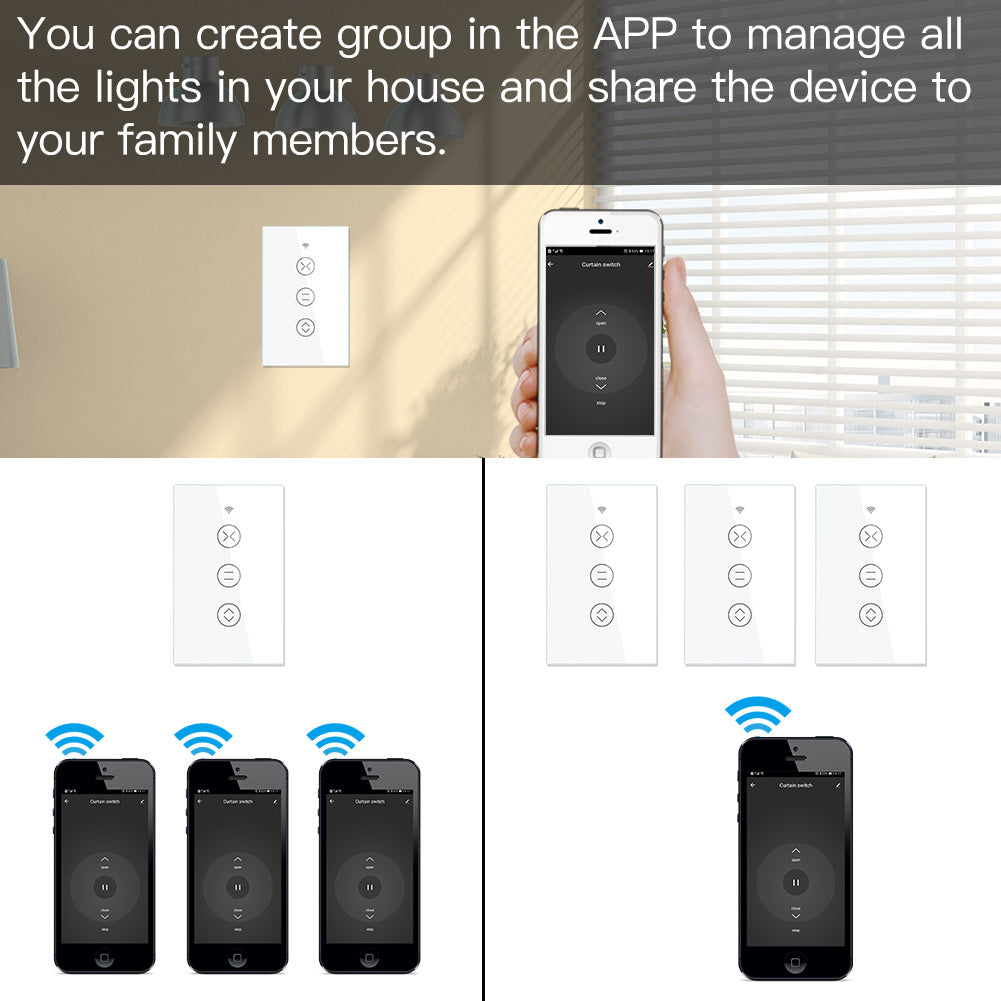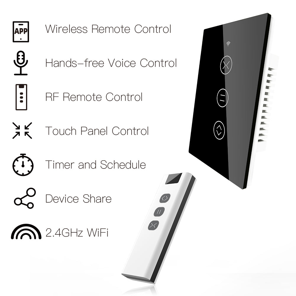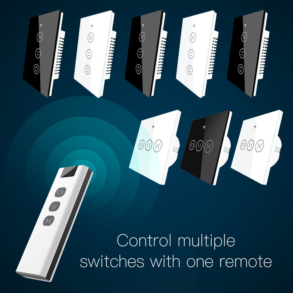 1.RF+WiFi Touch Panel Curtain Switch:With the powerful functional smart curtain switch,we are easily able to transform our house into a smart one.Intelligently control our curtains in a much easier and smarter way.RF remote and manual control your curtains optional.More importantly,one remote is able to control a group of smart curtain switches.Besides,it can work with smart curtain motor or roller shutter to realize automation for all curtains at home.Simply add motorized shades or other similar devices to your smart home with Smart Curtain Motor!(Note:the curtain motor is not included in the package,you need a self-purchase of it at we Moes.)